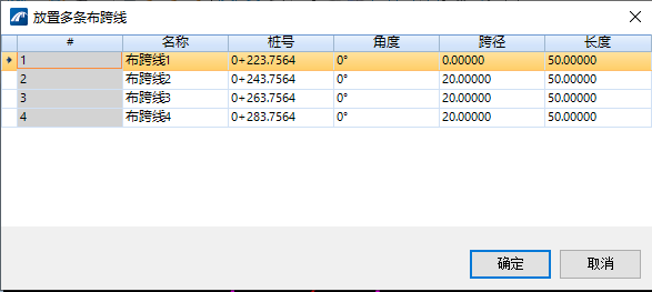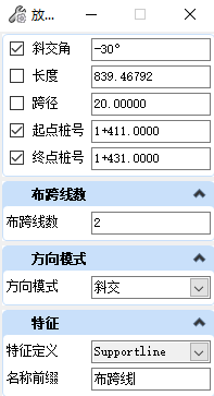 然后进行布跨线即桥墩中心线的创建,参数中“斜交角”控制桥梁的走向,正交桥梁斜交角默认为0°。“长