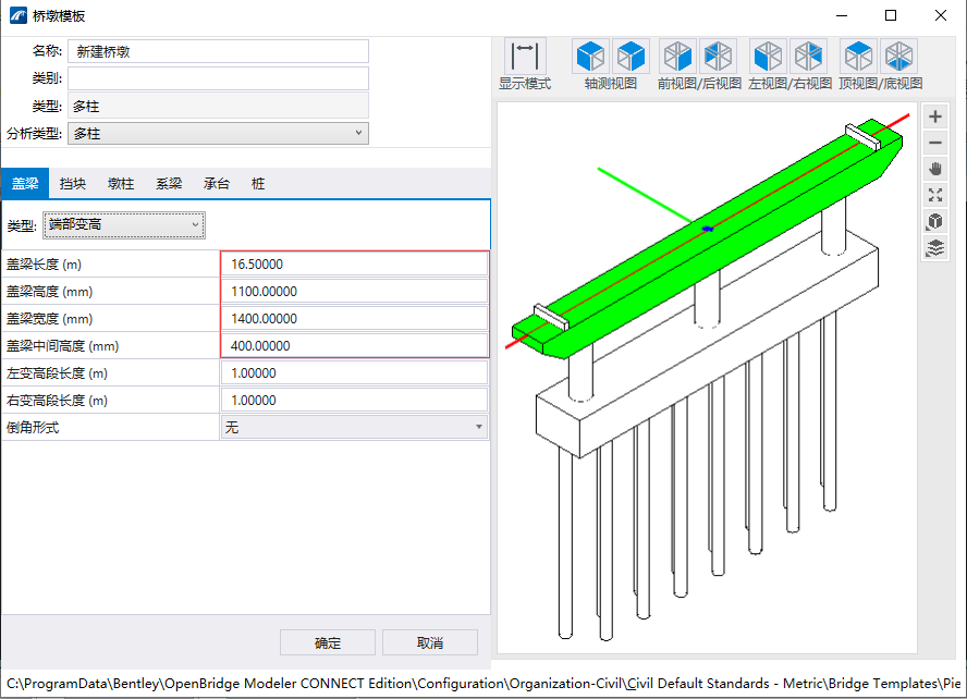 种,桥台有结构较简单的轻型桥台。在模板中可以对桥墩的盖梁、挡块、墩柱、系梁、承台和桩的类型及尺寸等