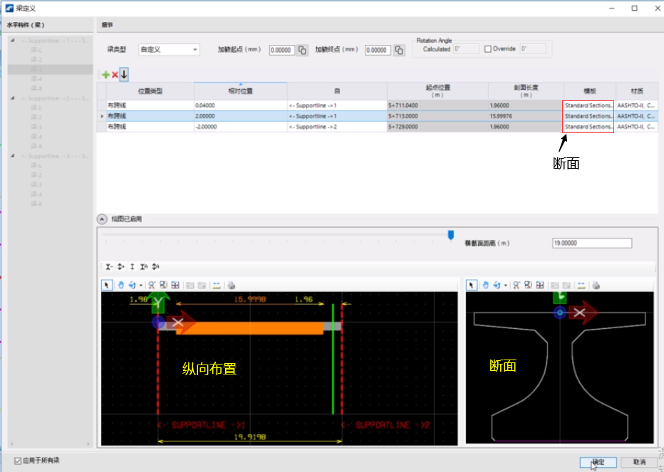 桥墩默认放置到主梁截面左下与右下关键点所确定的连线上,在后续设置了支座后,桥墩的位置可以根据支