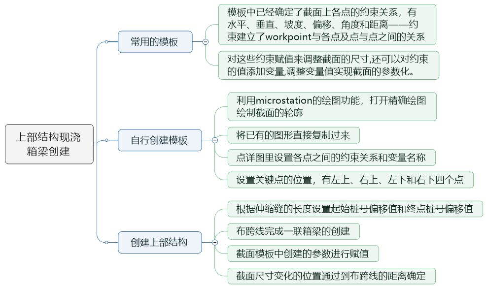 对于模板库中没有的截面形式,可以自行创建。利用microstation的绘图功能 打开精确绘图绘制截面的轮廓,或者将已有的图形直接复制过来。模板创建成功后在点详图里设置各点之间的约束关系和变量名称。然后还要设置关键点的位置,有左上、右上、左下和右下四个点,分别对应箱梁截面的顶板最大悬臂端点和底板左右两点,自定义模板-般左下和右下会捕捉到顶板下缘点,所以需要手动调整为底板左右两点。桥墩墩顶的位置便是以左下和右下两关键点确定的。