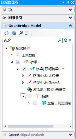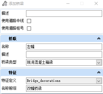在“主页”选项卡/“桥梁设置”面板/添加桥联命令,包括桥梁的名称,一般以施工方法分类,如现浇混凝土箱