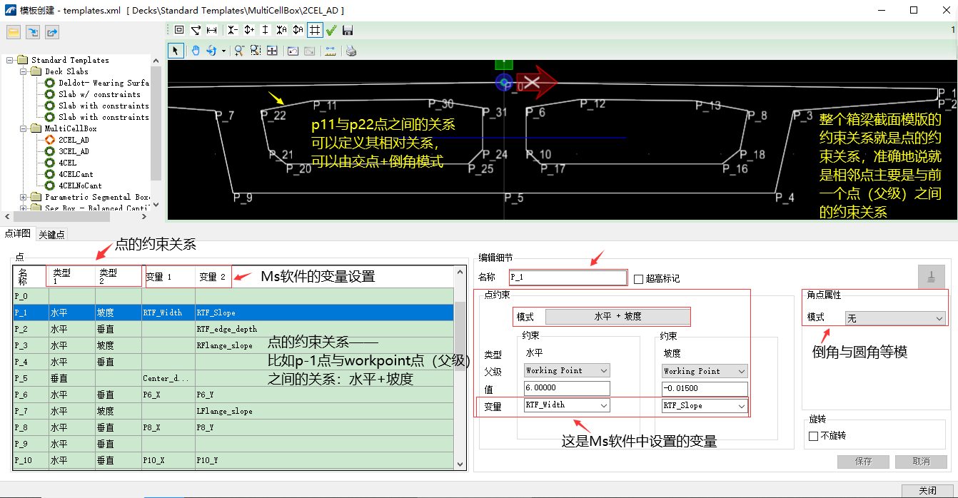 板主要有板式截面、多箱式截面(四箱)、参数化节段箱梁 (单箱)、AASHTO美国国家公路运输协会标准的悬臂法施工截面(单箱)和逐孔施工截面(单箱)。模板中已经确定了截面上各点的约束关系,有水平、垂直、坡度、偏移、角度和距离,利用这些约束建立了workpoint与各点及点与点之间的关系。通过对这些约束赋值来调整截面的尺寸,还可以对约束的值添加变量,调整变量值实现截面的参数化。