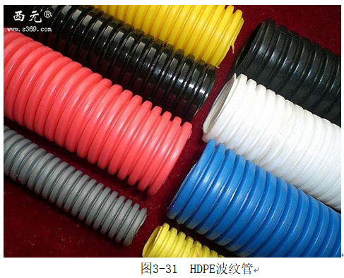 全称“建筑用绝缘电工套管”,执行标准:JG 3050-1998。分为两类:一类是白色的硬质PVC胶管,防腐蚀、防漏电、穿电线用的管子。一类是HDPE波纹管做“电工套管”,质优价廉,美观便捷。如图3-30,2-31 所示。