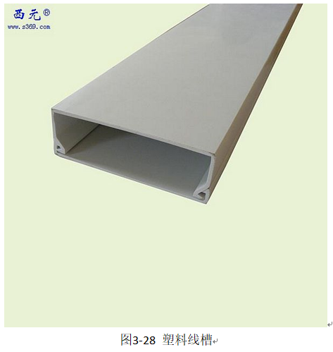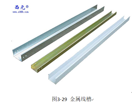 线槽又名走线槽、配线槽、行线槽,是用来将电源线、数据线等线材规范整理,固定在墙上或者天花板上的布线工具。线槽一般有塑料和金属两种材质,可以起到不同的作用。一般有塑料材质和金属材质两种(如图3-28,3-29所示),可以起到不同的作用。