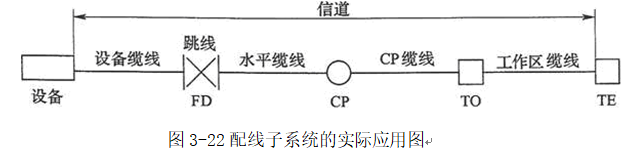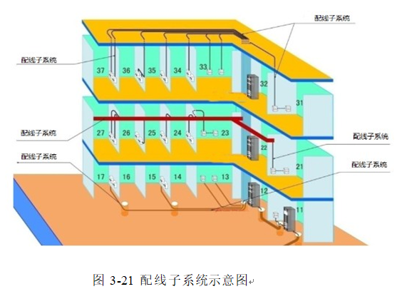 在GB50311-2007国家标准中,配线子系统应由工作区的信息插座模块、信息插座模块至电信间配线设备(FD)的配线电缆和光缆、电信间的配线设备及设备缆线和跳线等组成。如图所示。配线子系统一般在同一个楼层上,是从工作区的信息插座开始到电信间子系统的配线架,由用户信息插座、配线电缆、配线设备等组成。由于配线子系统最为复杂、布线路由长、拐弯多、造价高、安装施工时网络电缆承受拉力大,因此配线子系统的设计和安装质量直接影响信息传输速率,也是网络应用系统最为重要组成部分。图3-21为配线子系统的示意图。