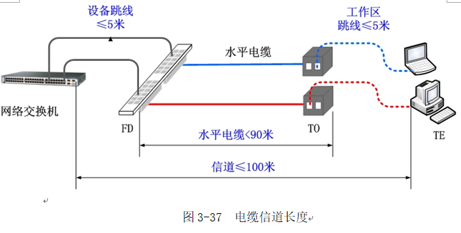 GB50311-2007国家标准中规定,双绞线的信道长度不能超过100m,因此配线子系统中双绞线长度一般不超过90米。如图3-37所示。