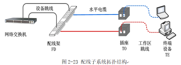 配线子系统为星型结构,如图2-23所示。每个信息点都必须通过一根独立的缆线与楼层电信间的配线架连接,然后通过跳线与交换机连接。