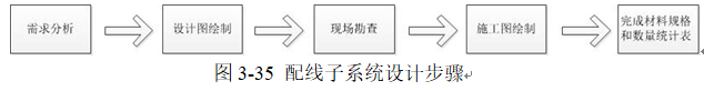 配线子系统设计的步骤一般为,首先进行需求分析,与用户进行充分的技术交流和了解建筑物用途,然后要认真阅读建筑物设计图纸,根据设计图纸进行现场勘查,再根据现场勘查的结果,绘制施工图纸,完成点数统计表,确认信息点位置和数量,确定每个信息点的配线布线路径,最后确定布线材料规格和数量,列出材料规格和数量统计表。一般工作流程如图3-35所示。