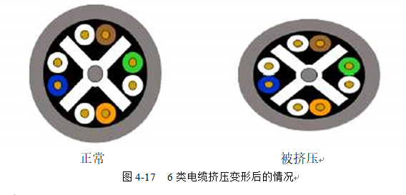 尽可能保持电缆的结构是敷设双绞线时的基本原则,如果是少量电缆,可以在很长的距离上保持线对的几何结构;如果是大量捆扎在一起的电缆,可能会产生挤压变形。如图4-17 所示是6类电缆挤压变形后的情况。