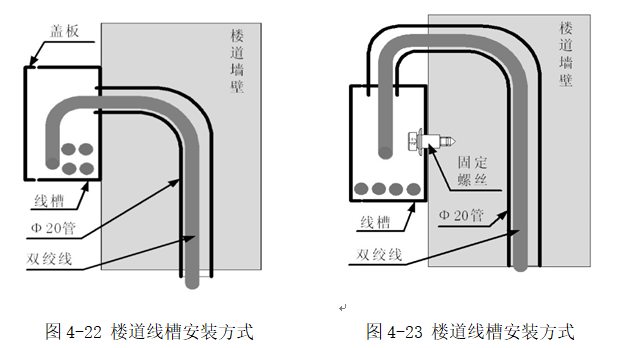 在一般小型工程中,有时采取暗管明槽布线方式,在楼道使用较大的PVC线槽代替金属桥架,不仅成本低,而且比较美观。一般安装步骤如下,如图4-22,4-23所示: