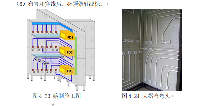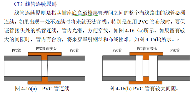 (4)首先在需要的位置安装管卡。然后安装PVC管,两根PVC管连接处使用管接头,拐弯处必须使用弯管器制作大拐弯的弯头连接。如图4-24所示。