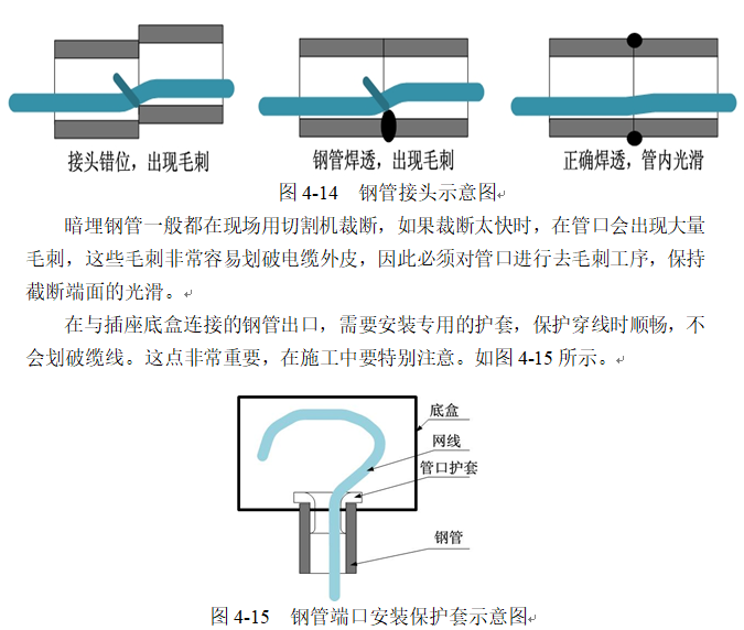 在钢管现场截断和安装施工中,两根钢管对接时必须保证同轴度和管口整齐,没有错位,焊接时不要焊透管壁,避免在管内形成焊渣。金属管内的毛刺、错口、焊渣、垃圾等必须清理干净,否则会影响穿线,甚至损伤缆线的护套或内部结构,如图4-14所示。
