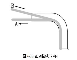 拉线过程中,缆线宜与管中心线尽量相同,如图4-22所示,以现场允许的最小角度按照A方向或者B方向拉线,保证缆线没有拐弯,整段缆线保持较大的曲率半径。