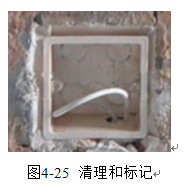 首先清理底盒内堆积的水泥砂浆或者垃圾,然后将双绞线从底盒内轻轻取出,清理表面的灰尘重新做编号标记,标记位置距离管口约60~80mm,注意做好新标记后才能取消原来的标记。如图4-25。