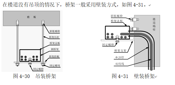 在楼道有吊顶时水平子系统桥架一般吊装在楼板下,如图4-30所示。具体要求如下: