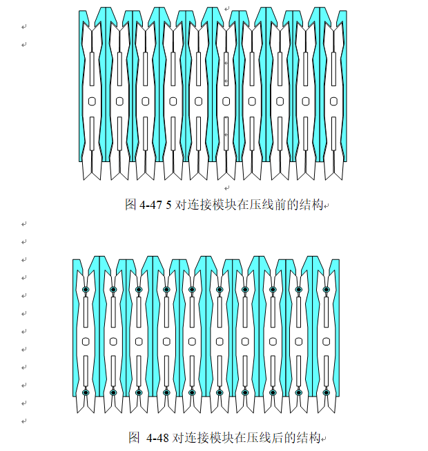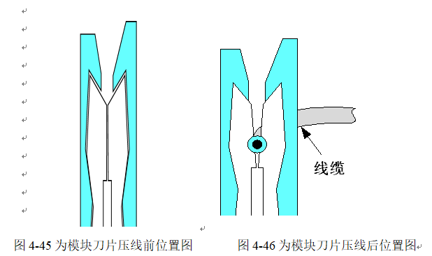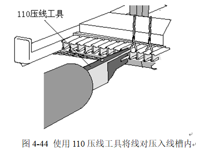 综合布线系统配线端接的基本原理是,将线芯用机械力量压入两个刀片中,在压入过程中刀片将绝缘护套划破与铜线芯紧密接触,同时金属刀片的弹性将铜线芯长期夹紧,从而实现长期稳定的电气连接,如图4-44。