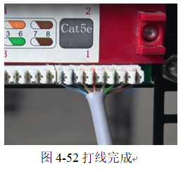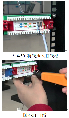首先在配线架的背面,将剥好的双绞线平行放入到中间的走线槽里,其护套边沿应在配线模块的中间位置。然后按照配线架上的颜色标示,将8根线逐根压入配线模块对应的打线槽里,注意线要排列整齐,不能缠绕交叉,如图4-51所示。