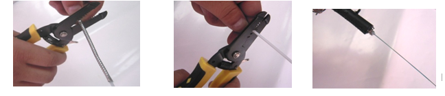 第二步:一只手握紧光缆,另一只手用斜口钳夹紧钢丝,向身体内侧旋转拉出钢丝,如图4-57;用同样的方法拉出另外一根钢丝,两根钢丝都旋转拉出,如图4-58。