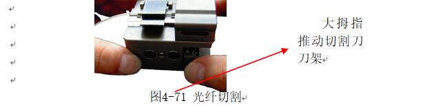 ⑤左手固定切割刀,右手扶着刀片盖板,并用大拇指迅速向远离身体的方向推动切割刀刀架。如图4-71示,此时就完成光纤的切割部分。