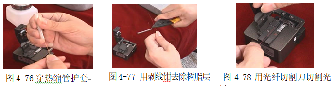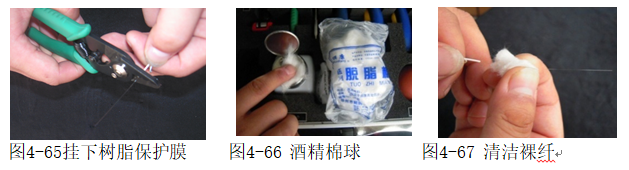 第四步:用酒精棉球,沾无水酒精对剥掉树脂保护套的裸纤进行清洁,如图66、4-67。