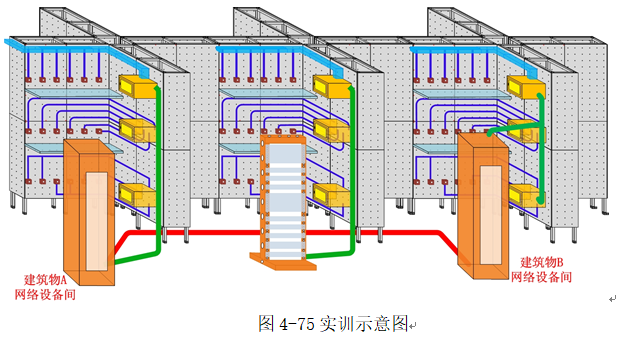 建筑物子系统的布线主要是用来连接两栋建筑物网络中心网络设备的,如图4-120红色线表示,建筑物子系统的布线方式有:架空布线法、直埋布线法和地下管道布线法、隧道内电缆布线,这里做光缆架空布线方式的实训。