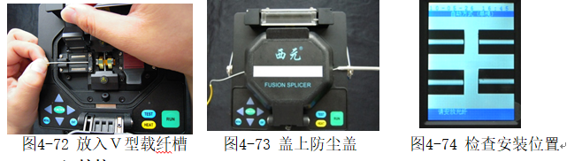 第二步:分别打开光纤大压板将切好端面的光纤放入V型载纤槽,光纤端面不能触到V型载纤槽底部,如图4-72。
