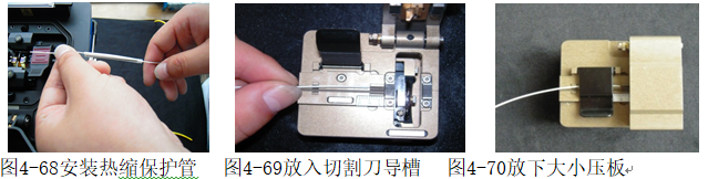 ③将安装好热缩套管的光纤放在光纤切割刀中较细的导向槽内,如图4-69。