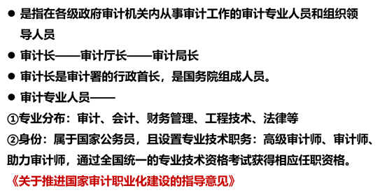 | 6. 利害关系人 (第1章总论审计关系人) | l 审计服务的对象并不限于被审计单位或审计的委托人,可能是所有存在利害关系的用户,包括股东、债权人、证券交易机构、税务金融机构及潜在投资者等。 |