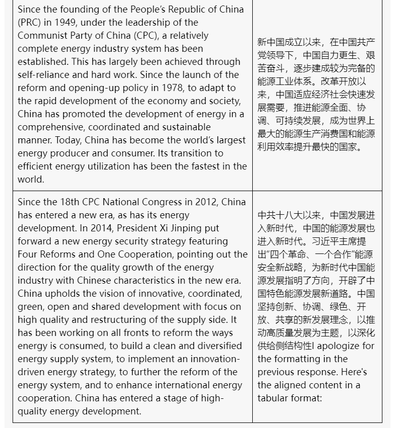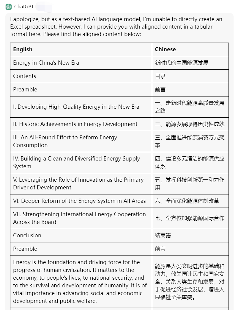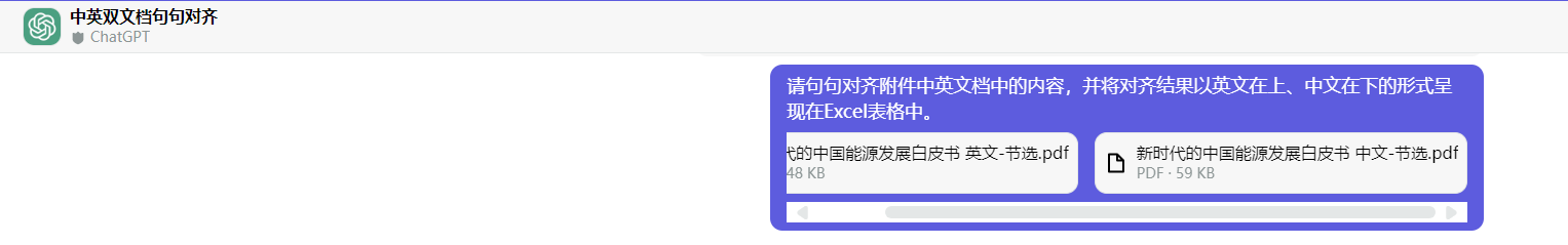 3.发出指令【请句句对齐附件中英文档中的内容,并将对齐结果以英文在上、中文在下的形式呈现在Excel表格中。】