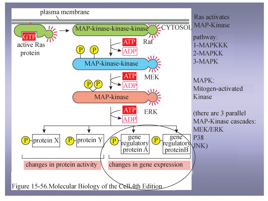 2 受体酪氨酸激酶介导的 RTK-RAS信号途径 受体酪氨酸激酶 (receptortyrosinekinase,RTK)是细胞膜表面常见的多肽生长因子类受体,包括表皮生长因子受 体、血小板生长因子受体、神经生长因子受体等,其结构的共同特点是整个分子可以 分成3个结构区,即细胞外的配体结合区、细胞内部具有酪氨酸蛋白激酶活性的区域 和连接这两个区域的跨膜结构。 受体酪氨酸激酶介导的 RTK-RAS信号通路与细胞增殖、细胞应激、细胞凋亡等 密切相关,具体过程如下:①生长因子 (配体)与 RTK 胞外结构域结合后,首先触发 膜上相邻的 RTK 相互靠近形成二聚体乃至寡聚体,并促进 RTK 胞内区的相互作用, 使胞内段互为对方激酶的底物,引发二聚体或寡聚体的自身磷酸化;②RTK 磷酸化激 活后与 Grb2通过SH2结构域结合,再与Sos的SH3结构结合,Sos激活 Ras(一种定 位于膜上的小分子 G 蛋白);③由于 Ras本身的 GTP酶活性不强,需要 GTP酶活化蛋 白 (GAP)的参与,活化的 Ras蛋白激活丝氨酸/苏氨酸蛋白激酶 (MAPKKK);④活 化的 MAPKKK 结合并磷酸化另一种蛋白激酶 (MAPKK),使其活化;⑤ 活化的 MAPKK 使 MAPK 的苏氨酸和酪氨酸残基磷酸化并使之激活;⑥活化的 MAPK 进入 细胞核,可以使许多转录因子活化,产生效应。Ras-MAPK 途径是多条信号通路共 有的通路,包括多种生长因子、细胞因子、G 蛋白偶联受体、整合素等都与此通路相关 (图6)。