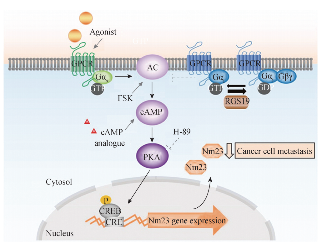 (2)G 蛋白偶联受体信号转导通路:G 蛋白偶联受体介导的信号转导是最典型的 膜受体信号途径,环境中的激素、神经递质、趋化因子和光线等各种因素能激活 G 蛋 白偶联受体,并触发细胞内的一系列信号通路.当细胞膜外信号分子与 G 蛋白偶联受 体结合后,受体构象变化,进一步激活附着在其细胞膜内侧端的异三聚体 G 蛋白,表 现为 G 蛋白上原先结合的 GDP被替换为 GTP;激活后的 G 蛋白会进一步激活其效应 蛋白,引发一系列的下游效应,其中所涉及的具体信号通路则取决于 G 蛋白的种类. 下面重点介绍两种类型. 1)腺苷酸环化酶与 CAMP信号转导通路:激素、神经递质等第一信使与相应的 膜受体结合后,可以激活 G 蛋白,并活化位于细胞膜上的 G 蛋白效应蛋白———腺苷酸 环化酶 (adenylate cyclase,AC),使 ATP转化生成第一信使cAMP,进一步分别引起 相应底物的磷酸化级联反应、离子通道活化等效应,参与调节细胞代谢、增殖、分化 等不同生 理 过 程.在 绝 大 多 数 细 胞,cAMP 特 异 地 活 化 cAMP 依 赖 性 蛋 白 激 酶 A (cAMP dependent protein kinaseA,PKA)来调节细胞的新陈代谢.一般而言,PKA可使某些 特 殊 的 底 物 蛋 白 磷 酸 化,这 种 底 物 蛋 白 通 常 是 cAMP 反 应 元 件 结 合 蛋 白 (cAM Presponsive element binding