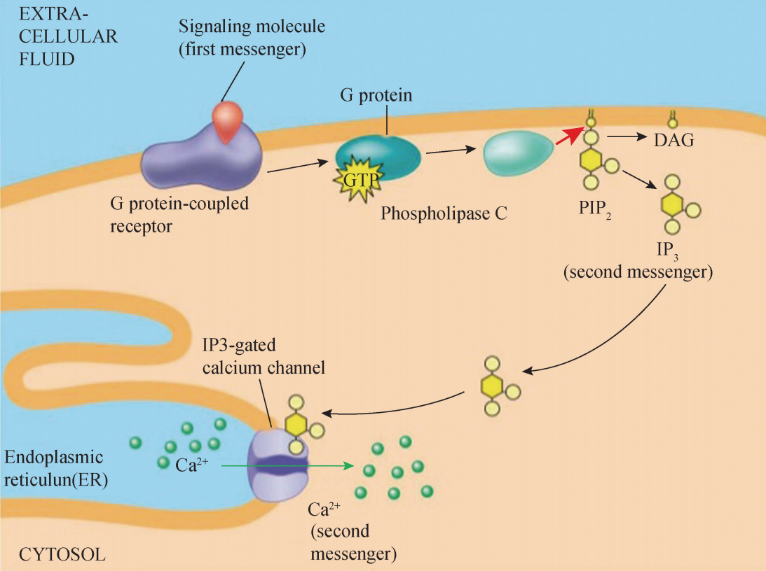 (3)胞内信号分子:膜受体将信号分子所携带的信号传递到细胞内,其中部分受 体在进行细胞信号的跨膜传递过程中产生如cAMP、cGMP、Ca2+ 等胞内小分子信号, 称为第二信使 (secondmessenger)。
