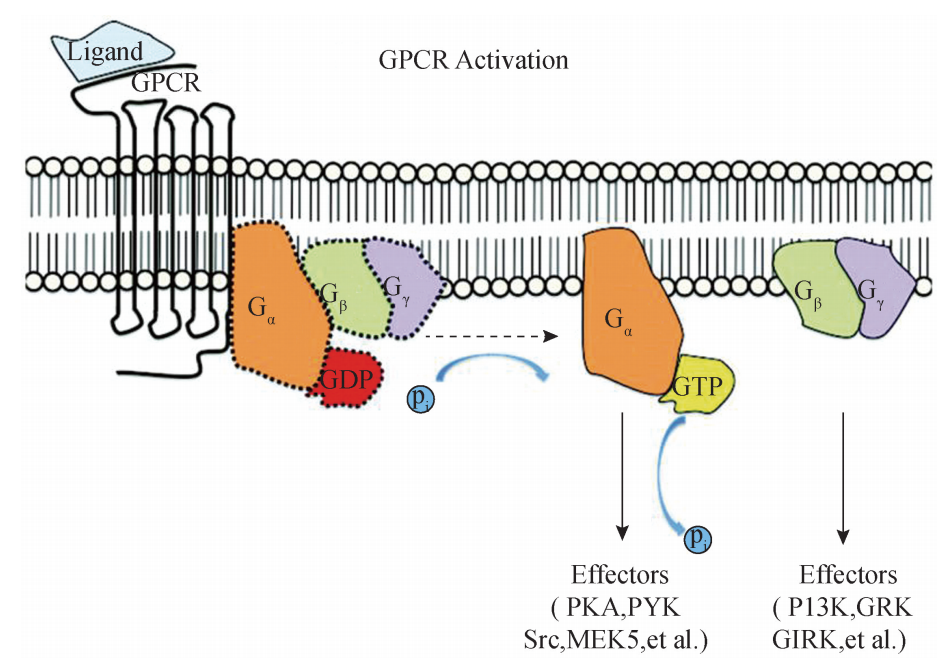 1G蛋白偶联受体信号转导途径 (1)G 蛋白的概况:G 蛋白 (GProtein)的全称为鸟苷酸结合蛋白 (guanine nucleotide bindingprotein),一般是指任何可与鸟苷酸结合的蛋白质的总称 (图)。 G 蛋白的特征是:①由α、β、γ等3个不同的亚单位构成的异聚体;②具有结合 GTP 或 GDP的能力,并具有 GTP酶 (GTPase)的活性,能将与之结合的 GTP 分解形成 GDP;③其本身的构象改变可进一步激活效应蛋白 (effectorprotein),使后者活化, 实现把细胞外的信号传递到细胞内的目的。G 蛋白分为3类:Gs、Gi和 Gq。其区别是 α亚基结构和活性的不同:Gs指 G 蛋白的a亚单位对效应蛋白起激活作用;Gi指 G 蛋 白的a亚单位对效应蛋白起抑制作用;Gq其功能尚未清楚。