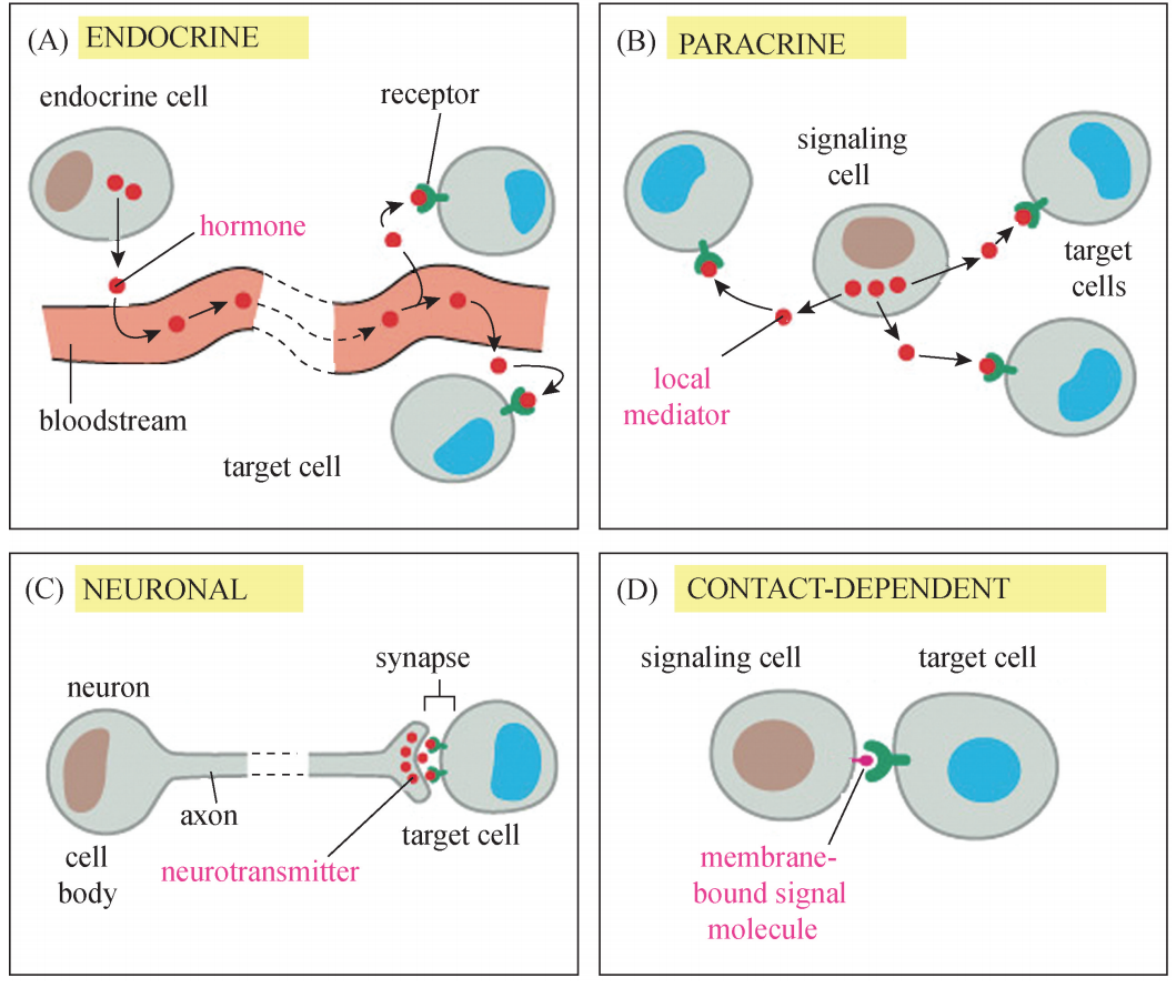 细胞间通讯 (Intercellular communication)是指细胞与细 胞之间的通讯,有四种类型 (图1)。(1)内分泌信号传递 (endocrine signaling):内分泌细胞 (endocrine cell)作为整 体控制细胞行为的第二种特化的信号细胞,分泌激素信号分子到血流中,血流再将信号运载到身体内广泛分布的靶细胞。(2)旁分泌信号传递 (paracrine signaling):大多数情况下信号分子是旁分泌信 号,对邻近的细胞起调控作用。旁分泌信号迅速地被周围靶细胞吸收,被胞外酶降解, 或者被胞外基质固定。(3)突触信号转导 (synaptic signaling):当来自环境或其他神经细胞的信号激活 神经细胞时,神经细胞沿着其轴突迅速地传递电脉冲,当该脉冲到达轴突末端时,导 致那里的神经末梢分泌称为神经递质 (neurotransmitter)的化学信号,化学突触的结 构能确保神经递质特异地传递到突触后的靶细胞。(4)接触依赖的信号传递 (contact-dependent signaling):某些信号分子结合在 信号细胞的表面上,只影响与之接触的细胞,在发育和免疫应答中尤其重要。