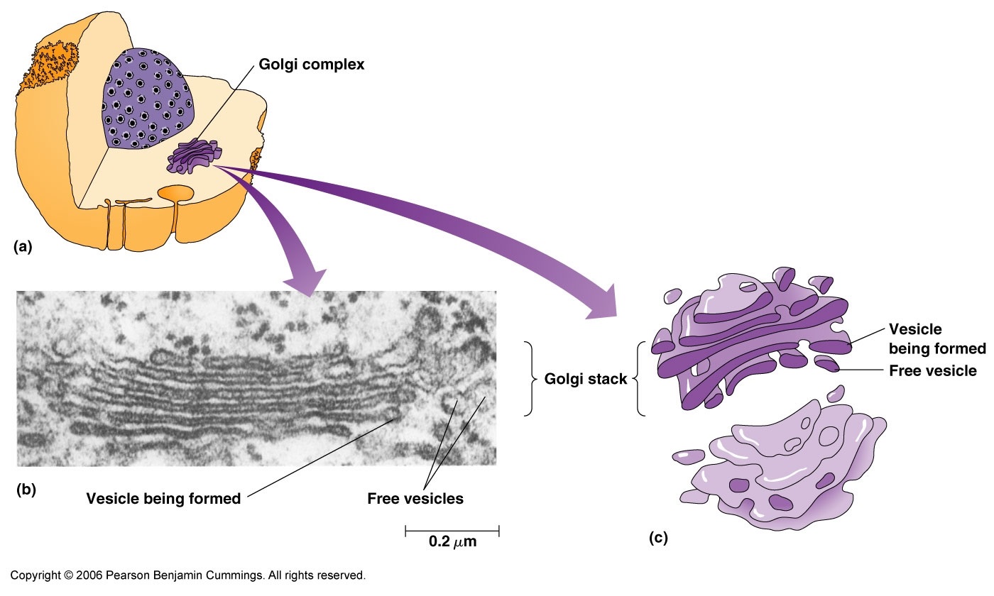 作为内膜系统的主要结构组成之一,高尔基复合体与内膜系统的其他结构一起构 成物质转运的特殊通道,不仅参与细胞的分泌活动和物质的定向运输,而且也是内质 网合成的蛋白质进行加工、分类、包装的重要场所。