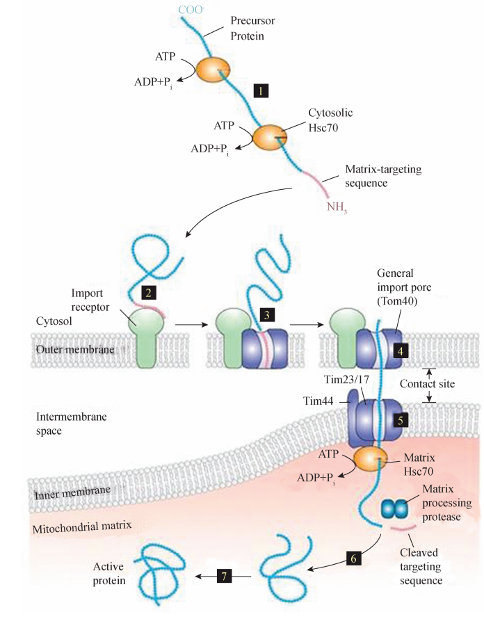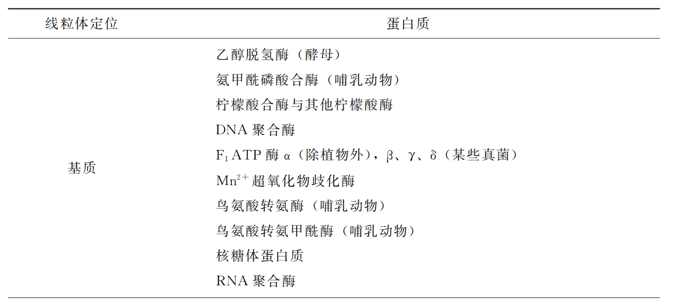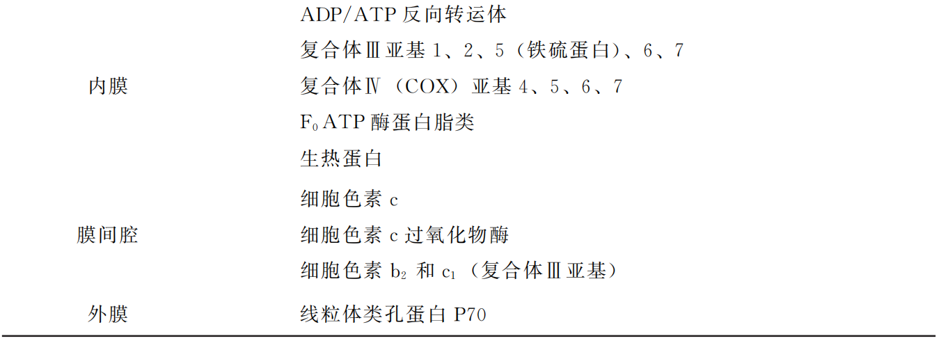 (三) 核编码蛋白向线粒体的转运 线粒体中大约有1000个基因产物,其中仅37个基因产物由线粒体基因组编码, 因此线粒体内大多数参与电子传递链的蛋白都是核基因组编码的线粒体蛋白 (表5G1G 3),这些蛋白质在胞质中合成后分别转运至线粒体的基质、内外膜及膜间腔中发挥生 物学功能。这里我们仅对核编码蛋白质向线粒体基质的转运过程进行详细阐述。