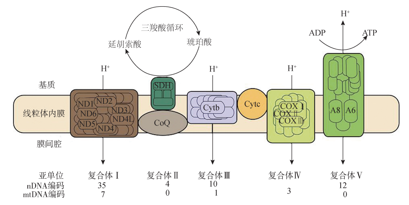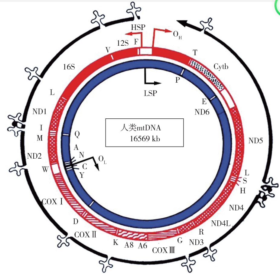 (一) 线粒体 DNA 线粒体是人和动物细胞唯一含有 DNA 的细胞器,线粒体 DNA 也称为线粒体基因组。线粒体 DNA 一般呈闭合双链环状结构,通常是裸露的,不与组蛋白结合,依附于 线粒体的基质内或存在于线粒体内膜。在一个线粒体内往往有1个至数个 mtDNA 分 子,平均为5~10个。大多数动物细胞的 mtDNA 平均为16000bp,主要编码线粒体的 tRNA、rRNA 及一些线粒体蛋白质,如电子传递链酶复合体中的亚基。但由于线粒体 中大多数酶或蛋白质仍由细胞核 DNA 编码,所以它们在细胞质中合成后经特定的方式 转送到线粒体中。 Anderson等于1981年测定了人类线粒体基因组全序列 (又称为剑桥序列),人线 粒体DNA 为一条双链环状的DNA 分子,共含有16569个碱基对 (bp)。双链中一为重 链 (H),一为轻链 (L),这是根据它们的转录本在 CsCl中密度的不同而区分的。重 链和轻链上的编码物各不相同 (图5G1G4)。人类线粒体基因组共编码了37个基因,分 别是:2个基因编码线粒体核糖体的rRNA (16s、12s);22个基因编码线粒体中的tRG NA,可满足线粒体蛋白质翻译中所有密码子的需要;13个基因编码线粒体氧化磷酸化 (OXPHOS)酶复合体的亚基,其中3个为构成细胞色素c氧化酶 (COX)复合体 (复 合体IV)催化活性中心的亚单位 (COX Ⅰ、COX Ⅱ和 COX Ⅲ),这三个亚基与细菌 细胞色素c氧化酶是相似的,其序列在进化过程中是高度保守的,2个为 ATP合酶复 合体 (复合体Ⅴ)F0部分的2个亚基 (A6和 A8),7个为 NADH-CoQ 还原酶复合 体 (复合体Ⅰ)的亚基 (ND1、ND2、ND3、ND4L、DN4、ND5和 ND6),还有一个 编码 CoQ 还原酶复合体 (复合体Ⅲ)中细胞色素b的亚基 (图5G1G5)。