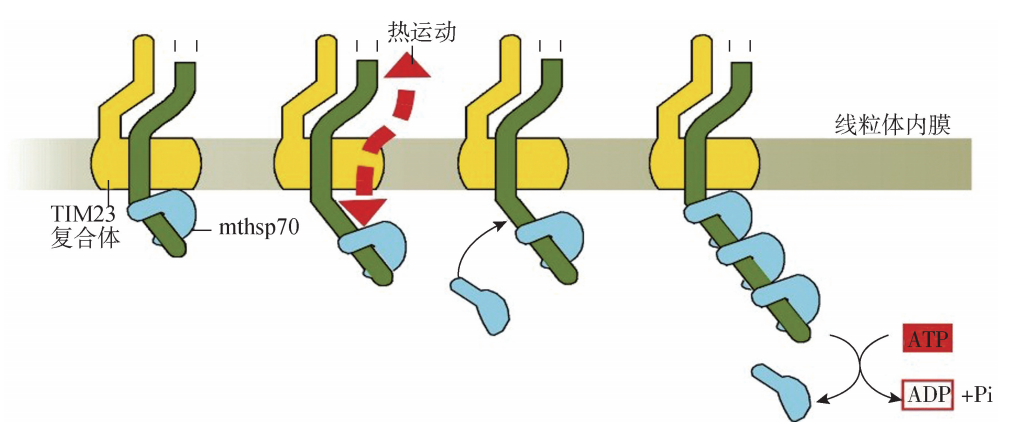 线粒体蛋白穿膜转运的布朗棘轮模型示意图