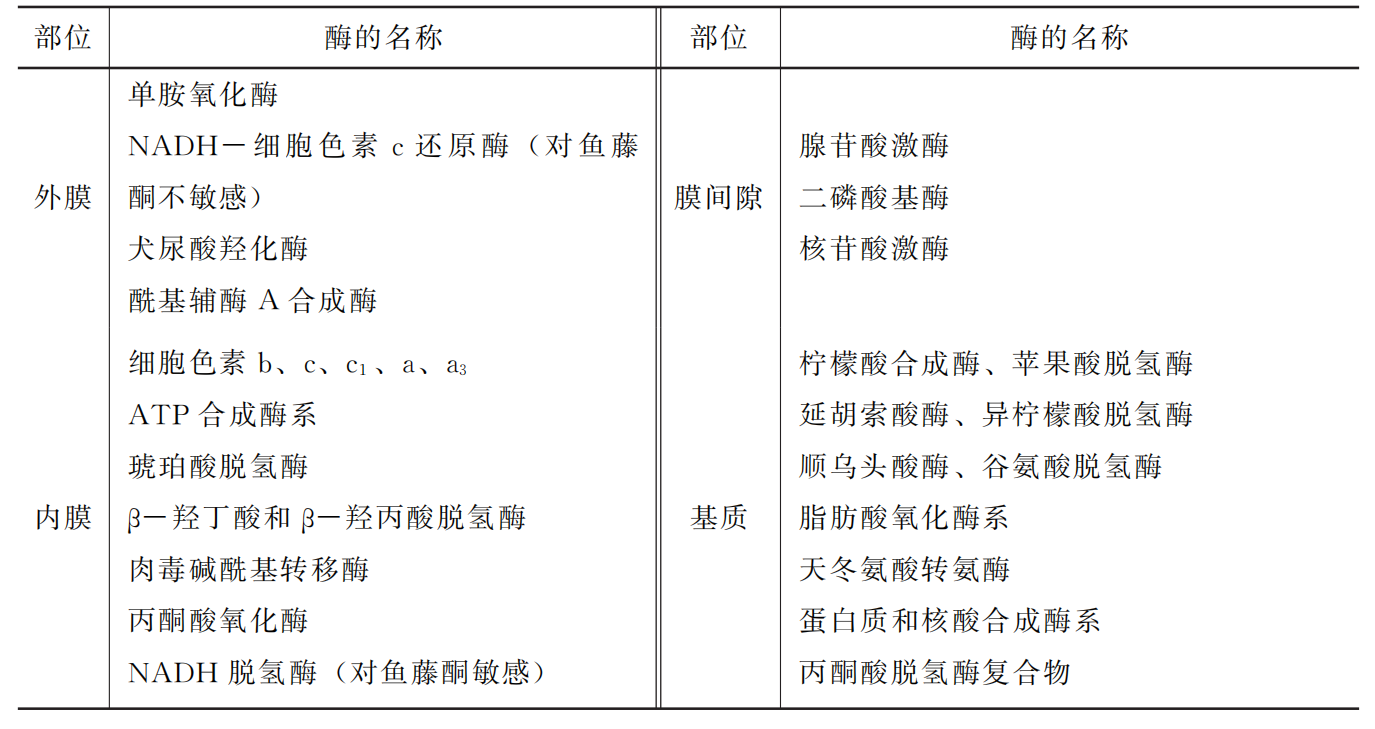 (一) 蛋白质 蛋白质是线粒体主要的化学成分之一,通常占线粒体干重的65%~70%。线粒体 蛋白质可分为两大类,即可溶性蛋白和不溶性蛋白。 可溶性蛋白主要是指线粒体基质中的酶和线粒体膜的外周蛋白,它的含量及所占 比例因细胞类型的不同而异。在肝细胞线粒体中,可溶性蛋白占蛋白总量的 50% ~ 70%;在牛心肌细胞线粒体中可溶性蛋白仅占15%左右,这与嵴的多少有关。 不溶性蛋白质线粒体膜内的镶嵌蛋白、内在蛋白和部分的酶,线粒体内膜和外膜 的不溶性蛋白分布是不同的。比较线粒体内膜和外膜不溶性蛋白的电泳迁移率,发现 外膜中仅含有14种不溶性蛋白;而内膜中可辨明的不溶性蛋白多达21种。 (二) 脂质 脂质是线粒体的重要组分,占线粒体干重的25%~30%。不同来源的线粒体,其 脂质组成成分虽然不尽相同,但均以磷脂为主,一般占脂质总量的3/4以上。其中含 磷脂酰胆碱 (卵磷脂)和磷脂酰乙醇胺 (脑磷脂)、心磷脂及少量的胆固醇。磷脂在内 外膜的组成不同,外膜主要是磷脂酰胆碱和磷脂酰乙醇胺、磷脂酰肌醇,内膜主要含 心磷脂,占其脂质总量的20%,这与内膜较低的物质通透性有关。内膜胆固醇的含量 不足外膜的1/6,同时外膜磷脂总量约为内膜的3倍,这是线粒体在化学组分上不同于 其他膜性细胞器的结构特点,也是线粒体结构中内膜区别于外膜的重要标志之一。 线粒体外膜脂质与蛋白质的比例为1∶1。从组分上看,线粒体外膜比内膜更接近 细胞内其他膜结构,线粒体内膜蛋白质与脂质的比例约为4∶1。线粒体内、外膜所含 脂质、蛋白质比例与种类的不同,是二者在化学组成上的根本区别,也是它们不同功 能特性的分子基础。 (三) 水、 无机盐离子及其他 水是线粒体中含量最多的一种成分,一般以结合水的形式存在线粒体类脂双分子 层中和某些大分子内部,为线粒体的结构组分之一;有的以自由水的形式分布于线粒 体膜间隙和基质中,充当酶促反应的溶剂及物质分散的介质。 一些含量甚微的无机盐离子,如钙、镁、锶、锰等二价阳离子,其浓度变化往往 直接影响线粒体的功能状态。研究表明,这些金属离子的聚集与分散,和线粒体基质 中由磷酸脂蛋白组成的电子致密的嗜锇酸基质颗粒 (matericalgranule)密切相关。 在线粒体中还存在有辅酶 Q (CoQ)、黄素单核苷酸 (FMN)、黄素腺嘌呤二核苷 酸 (FAD)、烟酰胺腺嘌呤二核苷酸 (NAD)等一系列重要的小分子有机物质。它们作 为辅酶 (或辅基)参与电子传递的氧化还原过程。 此外,线粒体基质中含有的 DNA、RNA 和核糖体颗粒等成分,构成了线粒体特 有的核外遗传及蛋白质合成体系,赋予线粒体一定的自主性(四) 酶的定位分布 线粒体是细胞质中含酶最多的细胞器之一,在不同来源的线粒体中,已发现140 多种酶。其中,氧化还原酶类约占37%,合成酶类占10%左右,水解酶不到9%。它 们定位分布于线粒体不同的结构区域或特定的位置,有些可作为某一功能部位的标志 酶,如分布于外膜的单胺氧化酶,膜间腔中的腺苷酸激酶,内膜的细胞色素氧化酶, 基质中的苹果酸脱氢酶。线粒体中一些主要酶的分布见表5G1G1。