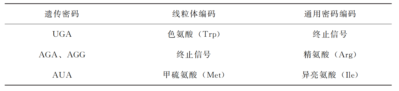 线粒体蛋白质的合成是独立进行的,其翻译系统的遗传密码与通用遗传密码存在 着部分差别 (表5G1G2)。例如,通用密码中 AGG 代表精氨酸,在哺乳类动物线粒体中 则为终止密码子;而作为通用密码中终止密码子的 UAG,在哺乳类动物和酵母细胞线 粒体中则成为编码色氨酸的密码子。尽管如此,组成线粒体翻译系统的核糖体大、小 亚基的蛋白质,几乎都是由核 DNA 编码合成后转运到线粒体内组装的