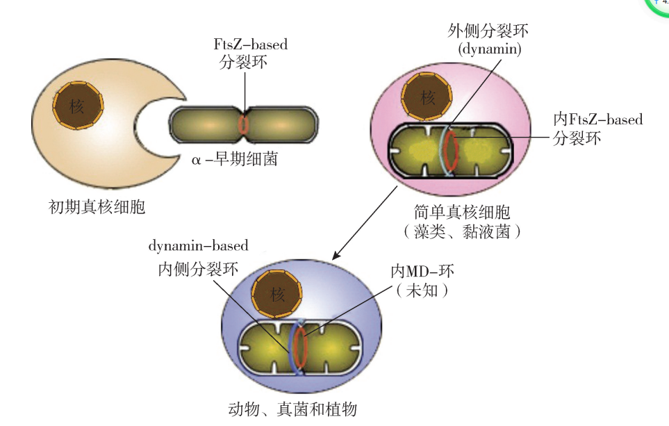 Uzzel等 (1974)提出非内共生学说。该学说认为,需氧型原始真核细胞的体积较 大,在进化过程中细胞膜逐渐发生褶皱与内陷,通过扩增细胞表面积来满足呼吸功能 的需要,细胞膜内陷形成的小囊就是线粒体的雏形。在漫长的进化过程中进一步发生 了分化,细胞核的基因组有了高度发展;线粒体的基因组则丢失一些基因;并演变为 专门具有呼吸功能、完善结构的线粒体。 (二) 线粒体的增殖 线粒体增殖的 “重新合成说” “非线粒体结构起源”等都曾产生过一定的影响。但 线粒体 DNA 发现后,多数生物学家普遍接受了分裂增殖的观点:线粒体是以分裂的方 式进行增殖的。C等 (1975)认为,线粒体的生物发生过程分为两个阶段。在 第一阶段,线粒体进行分裂增殖;第二阶段包括线粒体本身的分化过程,建成能够行 使氧化磷酸化功能的结构。线粒体的分裂增殖和分化阶段分别接受细胞核和线粒体两 个独立的遗传系统控制。放射性核素标记追踪研究及电镜观察结果也为这一观点提供 了充分的证据。但是,关于线粒体如何进行分裂增殖的,目前尚未完全明了。线粒体 分裂增殖的主要方式,可归纳为以下3种。 1 出芽分裂增殖 见于藓类植物及酵母细胞中,先由线粒体芽生出一球状小体, 随后,该小体与母体分离并逐渐长大,形成新的线粒体。