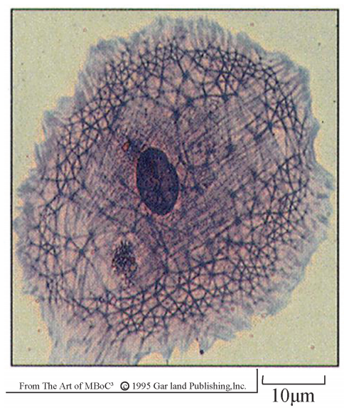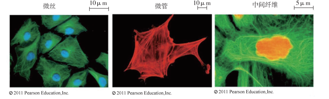 细胞骨架是由一组特殊的、不同类型的蛋白质 单体组装而成的丝状或管状结构 (图6G0G1).它们 在各自辅助蛋白的帮助下,动态聚合成三种主要形 式:肌 动 蛋 白 丝 或 微 丝 (Actinfilamentsor MiG crofilaments),微管 (Microtubules),中间丝 (InG termediatefilaments,IFs) (图6G0G2).细胞骨架 (theCytoskeleton)结构帮助细胞达到维持特定形 状和功能的目的.例如,血液中运输氧气和二氧化 碳的红细胞在直径大于其自身的血管中运行时,保 持双面凹的圆盘状,而进 入 微 小 孔 径 的 毛 细 血 管 时,红细胞通过其细胞骨架结构的动态变化完成变 形,顺利通过该段狭窄管径.再如,组成人体运动 系统的肌肉组织的收缩和舒张,也是在细胞骨架的 参与下完成的.除此之外,白细胞在组织间游走、 清除入侵的病原微生物或发生癌变的细胞,以及组织损伤时,祖细胞通过分裂增殖完 成组织的再生修复,细胞骨架都发挥了关键作用.