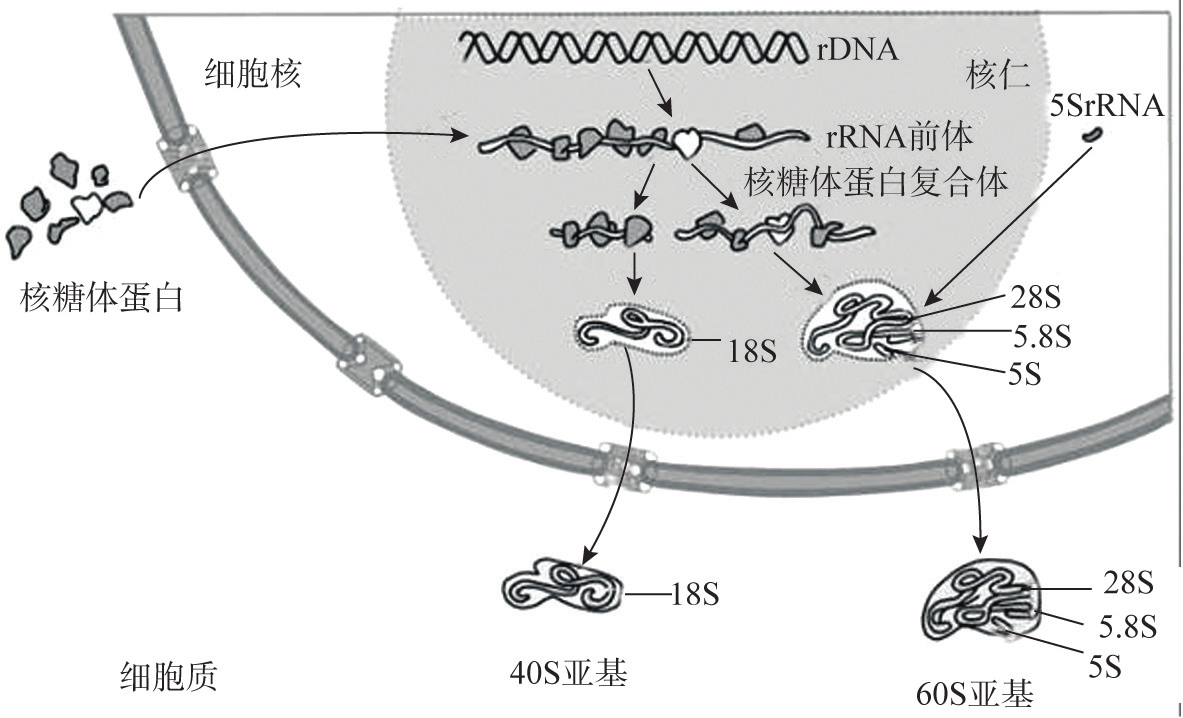 真核细胞中由核仁内新合成的45SrRNA前体很快与来自胞质的80余种蛋白质结合,形成核糖体蛋白复合体,之后在酶的催化下,失去一些蛋白质和RNA,裂解形成28SrRNA、18SrRNA和58SrRNA。208SrRNA、58SrRNA与来自核仁外的5SrRNA和46种蛋白质装配成60S大亚基;18SrRNA与来自核仁外的33种蛋白质装配成40S小亚基。在核仁中形成的大、小亚基被运输到细胞质,进一步装配成功能核糖体(图7G4G3)。