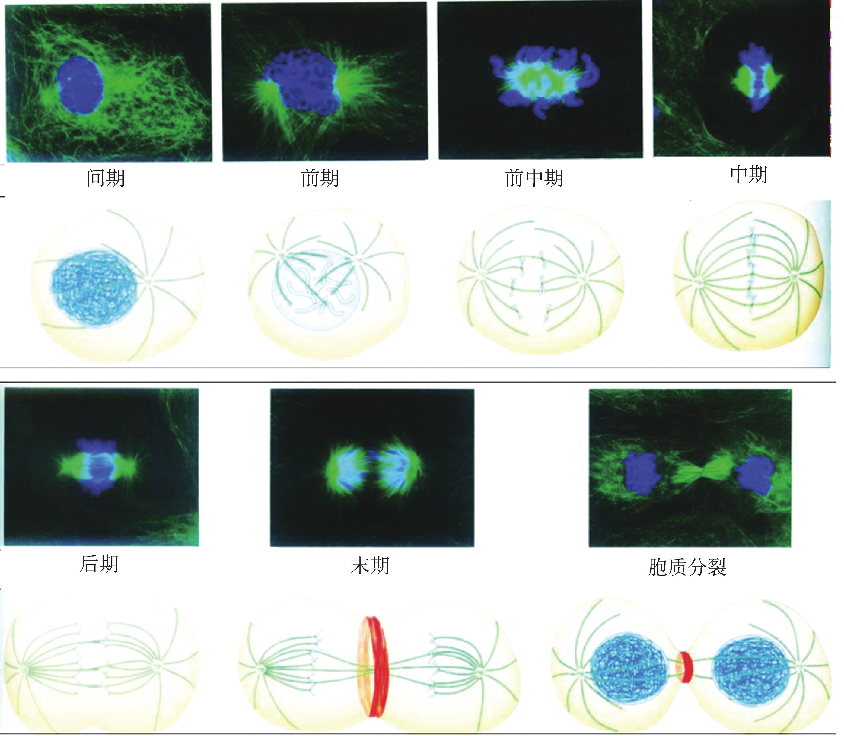 在细胞分裂过程中,细胞核的分裂和细胞质的分裂在时间和空间上紧密配合,相互依赖,相互制约,构成一个复杂而连续的动态过程。根据细胞分裂期核膜、染色体、纺锤体装配及核仁等形态结构的规律性变化,将有丝分裂过程分为前期、中期、后期和末期(图8G1G2)。