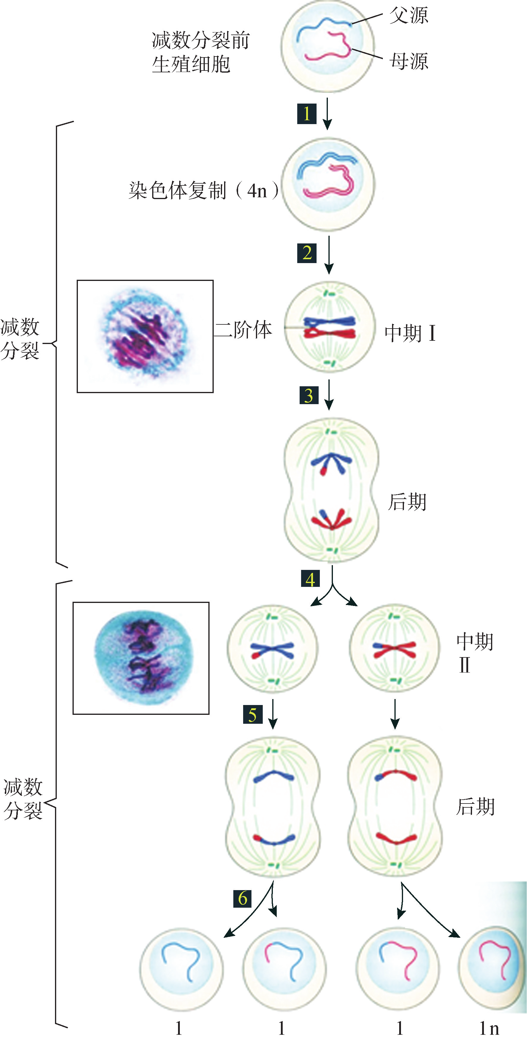 动粒微管连接到染色体的动粒上,牵引染色体运动。染色体排列形成赤道板,细胞即进入短暂的中期。随后着丝粒断裂,姐妹染色单体彼此分离,分别向纺锤体的两极移动,最终细胞发生一分为二等后期和末期事件。经过上述的两次减数分裂,由1个母细胞分裂成4个子细胞。子细胞的染色体数目只有母细胞的1/2,成为单倍体的生殖细胞。