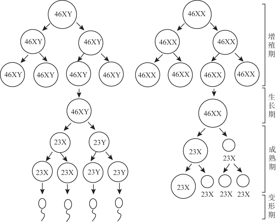 有性生殖生物的精子与卵子的形成过程称为配子发生(gametogenesis)。在形成过程中,精子和卵子虽然是来自不同性别的亲代,经历的过程也有一定的差异,但却有一个共同的特点,即经过一系列的有丝分裂后,在成熟期都要进行减数分裂。人类精子和卵子的形成过程均需要经历增殖期、生长期、成熟期,精子细胞的产生还要经过变形期(图8G1G4)。1个精母细胞经过2次减数分裂,产生4个均一的、具有生理功能的精子;1个卵母细胞经第1次减数分裂形成1个很大的次级卵母细胞和1个很小的第1极体(只有细胞核)。第2次减数分裂又产生1个很大的卵细胞和1个很小的第2极体,同时第一极体也一分为二。所以一个卵母细胞经过2次减数分裂产生1个卵细胞和3个极体,它们都是单倍体(n=23),3个第二极体均退化。