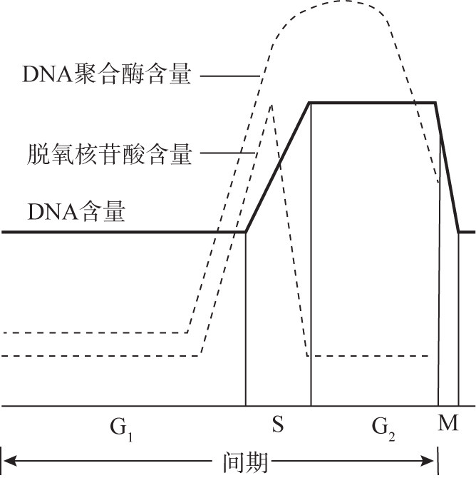 G1期是细胞生长的主要阶段,在周期时间中所占的比例最大。此期合成细胞生长所需要的各种RNA、糖、脂等,RNA的合成导致结构蛋白和酶蛋白等形成,但不合成DNA,为进入DNA合成期做物质准备。实验证明,在G1期晚期到S期这一阶段,与DNA合成有关的酶和底物含量增高,尤其是DNA聚合酶的活性急剧升高(图8G2G2)。