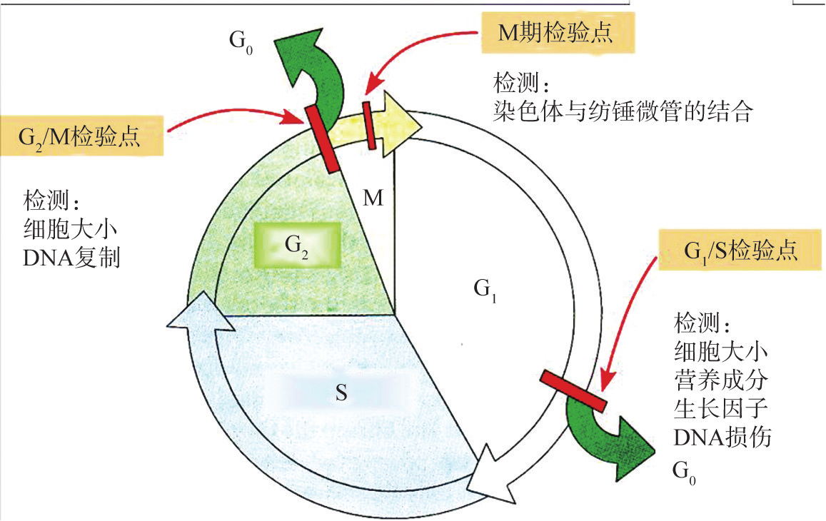 关于G1期的调控早期研究主要集中在细胞周期的特性上。正常细胞从G1期晚期到S期阶段有1个或2个特殊的调节点,称为限制点(restrictionpoint,R点)或检验点(checkpoint)。R点起到了控制细胞增殖周期开和关的“阀门”作用。细胞是继续增殖还是进入静息(G0)期,是由它能否通过R点来决定的。当细胞处在不利条件下,如营养匮乏、药物等,细胞代谢速度降低,进入G0期以延长细胞生命;而肿瘤细胞往往失去全部或部分R点的控制,故细胞能不断地进行分裂。