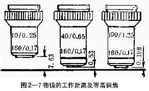 当物像清晰时,物镜镜面与标本之间的距离,称为工作距离。物镜放大倍数越高,工作距离越短,反之亦然(图 2-7)。显微镜厂家根据物镜的工作距离,确定每个物镜的高度,使不同放大倍数的物镜基本处于同一焦面上。因此在低倍镜成像后再换高倍镜或油镜,都应见到物像,或用细调节器稍微调节即可,这称等高调焦或同高调焦。更换标本时,应先转开物镜,再取出或放置标本,防止物镜擦标本片损坏物镜。