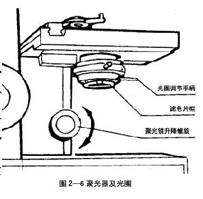 (2)聚光器:位于镜台通光孔下方,由一组透镜组成,可使人工光源的光线集中于标本上,以增加亮度。其左下方有一螺旋,转动时可升降聚光器。上升时,光线增强;下降时则光线减弱(图 2-6)。